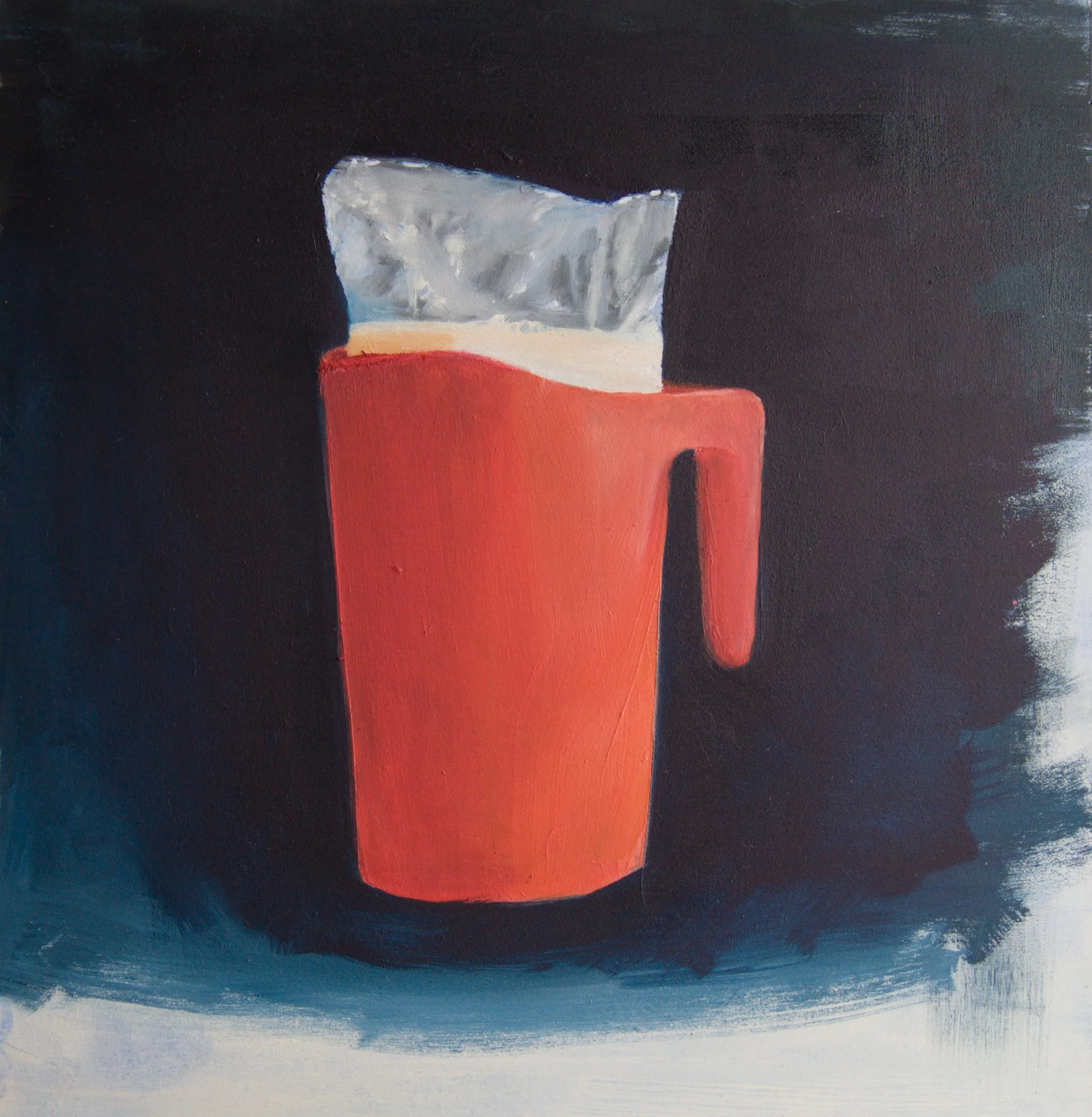 This work is representative of an exploration of still life as an extension of a found object practice. The orange plastic pitcher belonged to my grandmother. It is older than I am. I inherited it when I moved into my grandparents’ house, and use it daily. I have used bagged milk my entire life. That doesn’t make it any less frustrating. How did structures evolve to bring us to this point? Can we move past bagged milk? would what we move to be better?