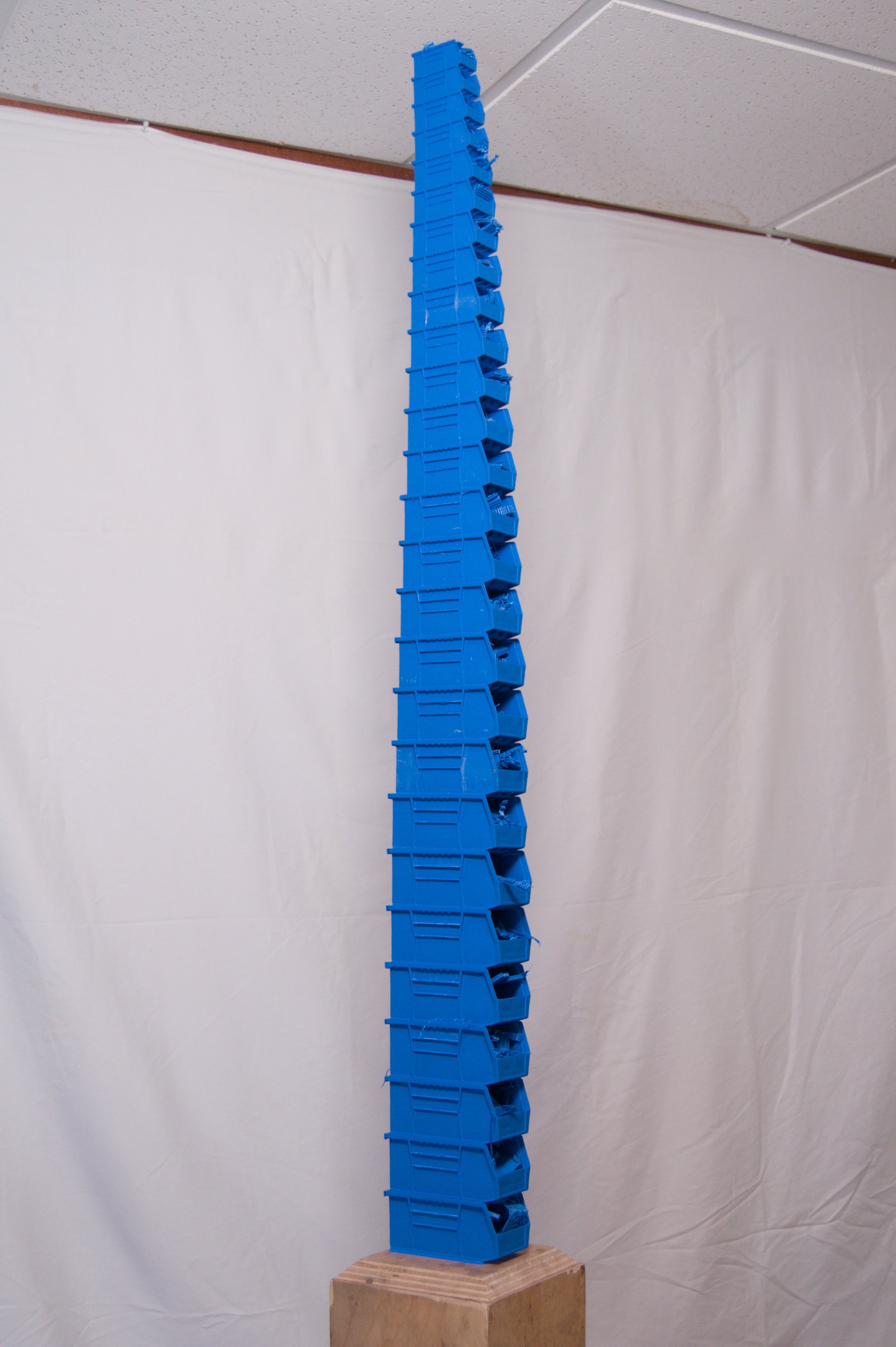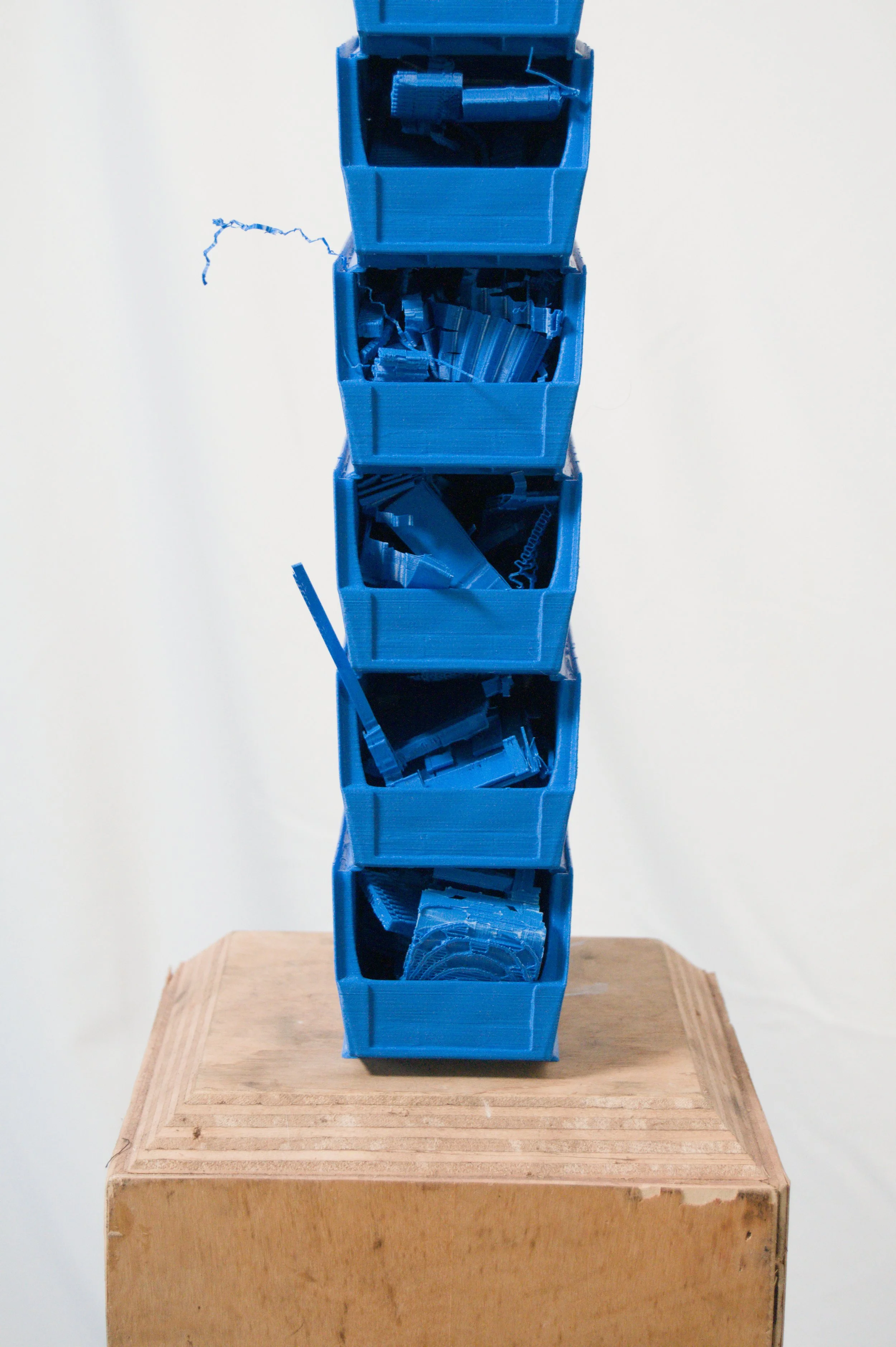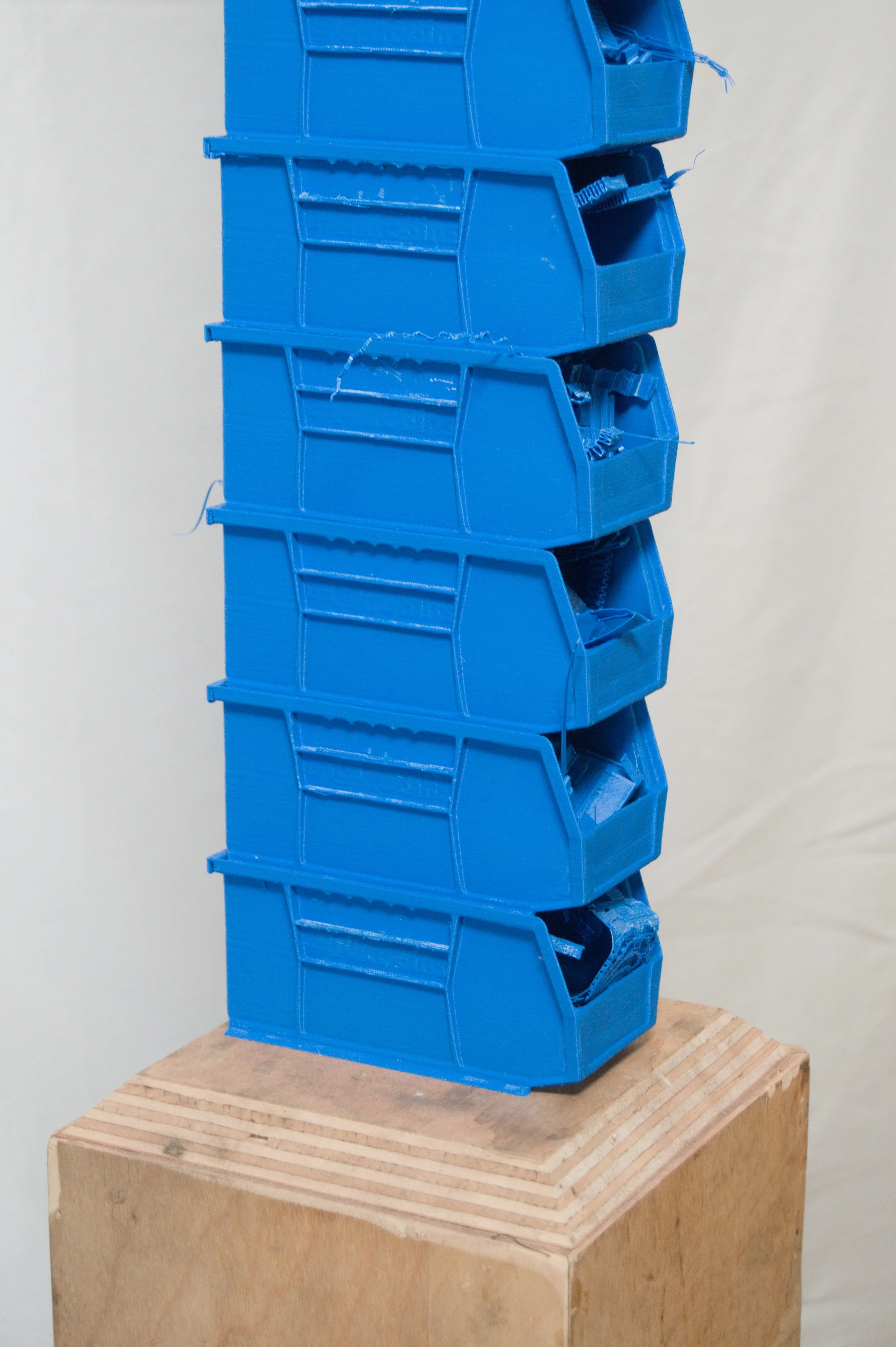 Each blue bin is a copy of the others, holding within them the supports that were necessary for their creation.