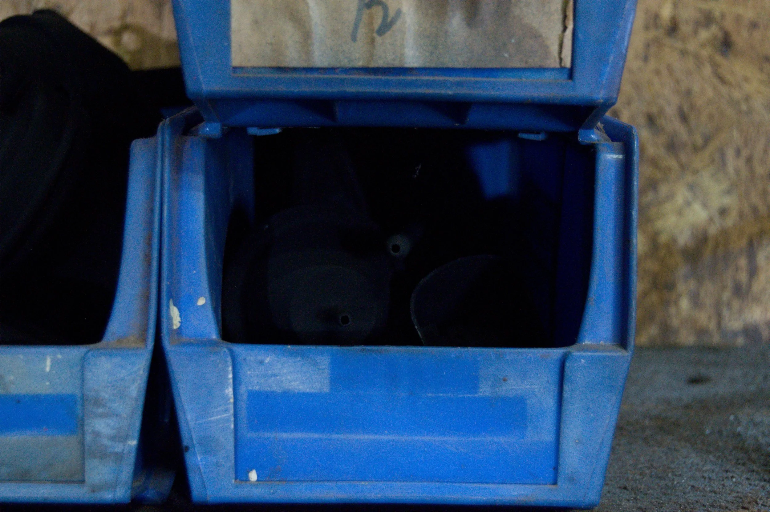 (2025) blue plastic bins, assorted car parts, paper label, "Musou Black" paint